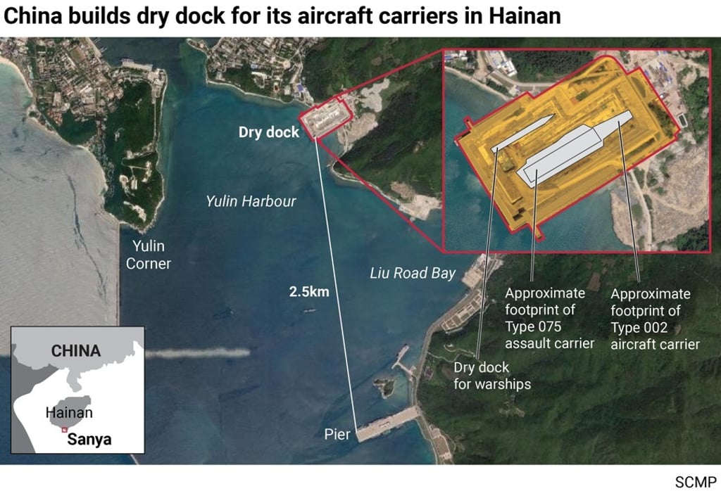 A dry dock being built at China’s naval complex on the island province of Hainan in the South China Sea will be big enough to accommodate the country’s new generation of aircraft carriers, military analysts say.