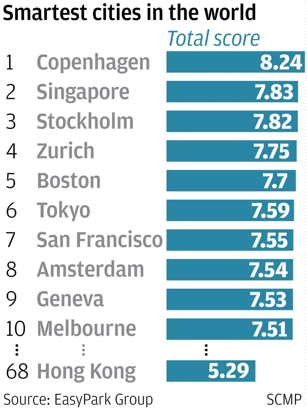 Hong Kong scored 5.29, compared with 8.24 for the Danish capital, 7.83 for Singapore and 7.82 for Stockholm, which was ranked third.