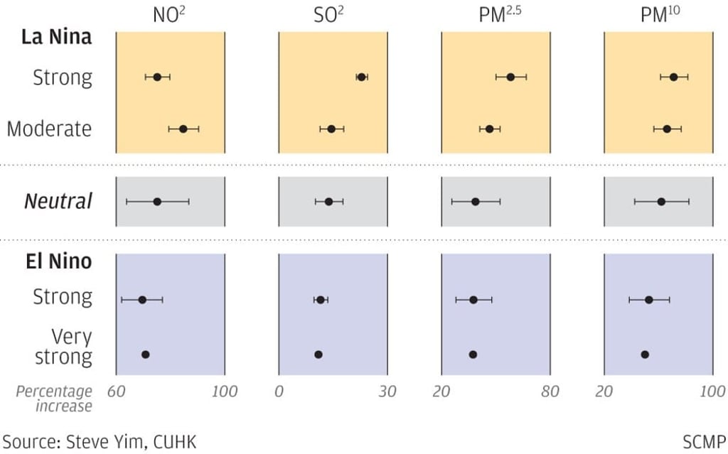 According to Chinese University researchers, Hong Kong’s air quality is usually higher under El Niño conditions as the associated weather – more rain, less frequent northerly winds and higher wind speeds – tend to disperse pollutants.