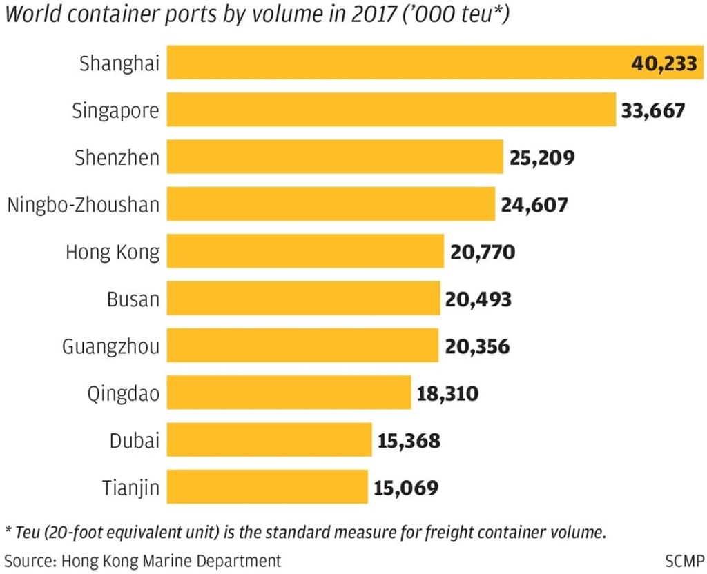 Hong Kong is the world’s fifth-largest port in terms of total containers shipped, down from fourth in 2014. It lags Singapore and three mainland Chinese ports: Shanghai, Shenzhen and Ningbo-Zhoushan.