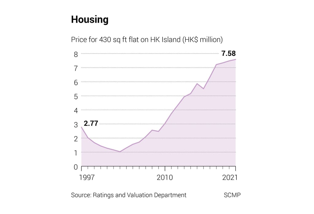 Meanwhile, private home prices soared by 136 per cent between 1997 and the first quarter of 2021. In 1997, a 430 sq ft flat on Hong Kong Island would have cost HK$2.77 million (US$353,000. Early last year, it was HK$7.6 million. The price of a flat of the same size in the New Territories would have gone up from HK$2.4 million to HK$6.1 million over the same period.