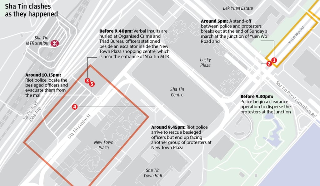 Riot police were sent to a Hong Kong shopping centre on Sunday to rescue more than 20 detectives who were surrounded by extradition bill protesters, with a confrontation between both sides ending in bloody clashes, the Post has learned.