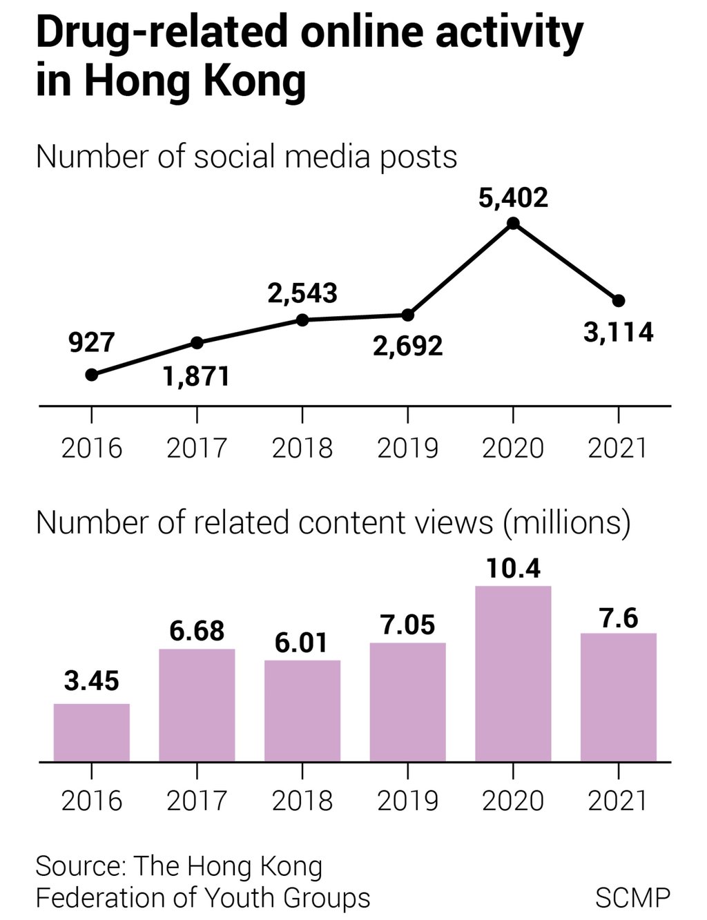 - Research by Hong Kong Federation of Youth Groups shows social media content featuring drugs rose from 927 in 2016 to 3,114 by the end of last year