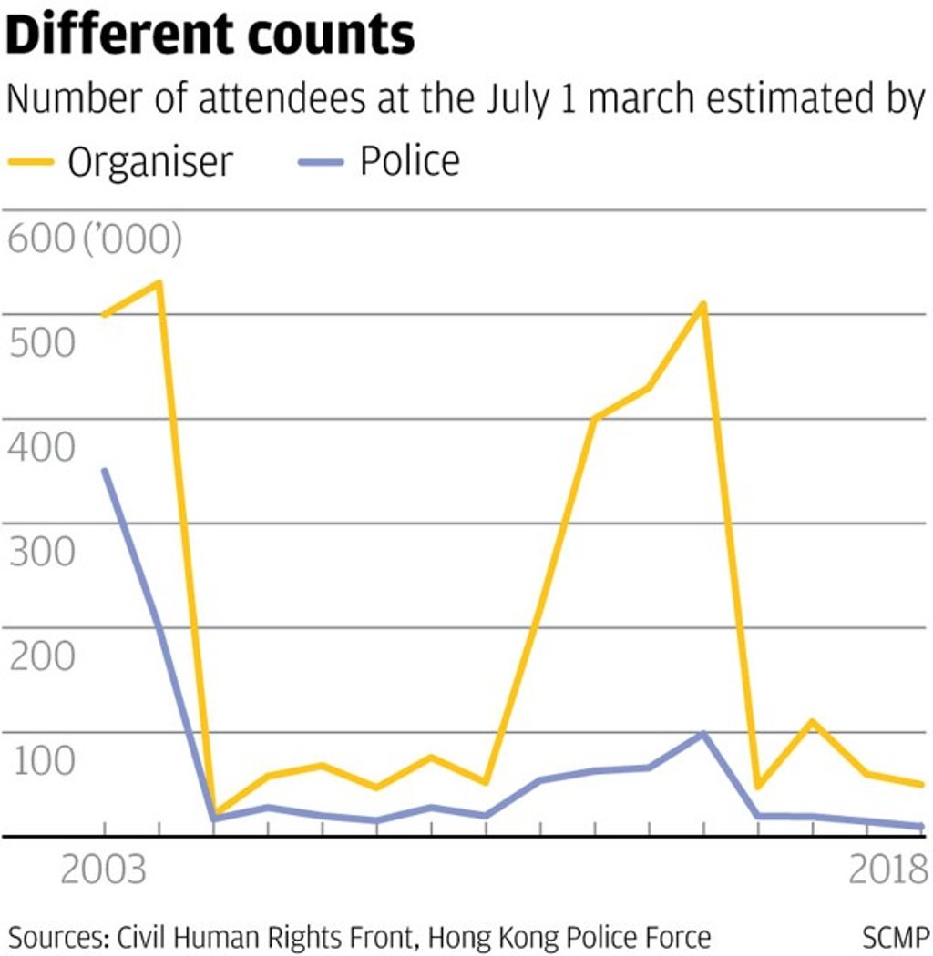 The Civil Human Rights Front, the organiser of the annual July 1 pro-democracy march, claimed more than 50,000 had joined – less than last year’s 60,000 and hitting a three-year low – while the police put the turnout at 9,800, down from last year’s estimate of 14,500 and its lowest level since 2003.
