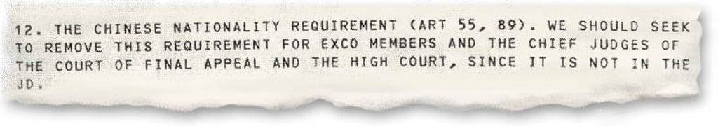 The British government in 1989 dismissed calls from then Hong Kong governor David Wilson to push back against a proposed constitutional requirement that high-ranking judges and top government advisers be Chinese citizens after the city’s handover.