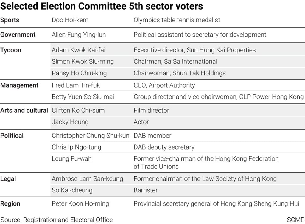 - The group, all members of pro-Beijing ‘national organisations’, is tasked with choosing who will fill the committee’s newly created fifth sector – and they can run for slots themselves
