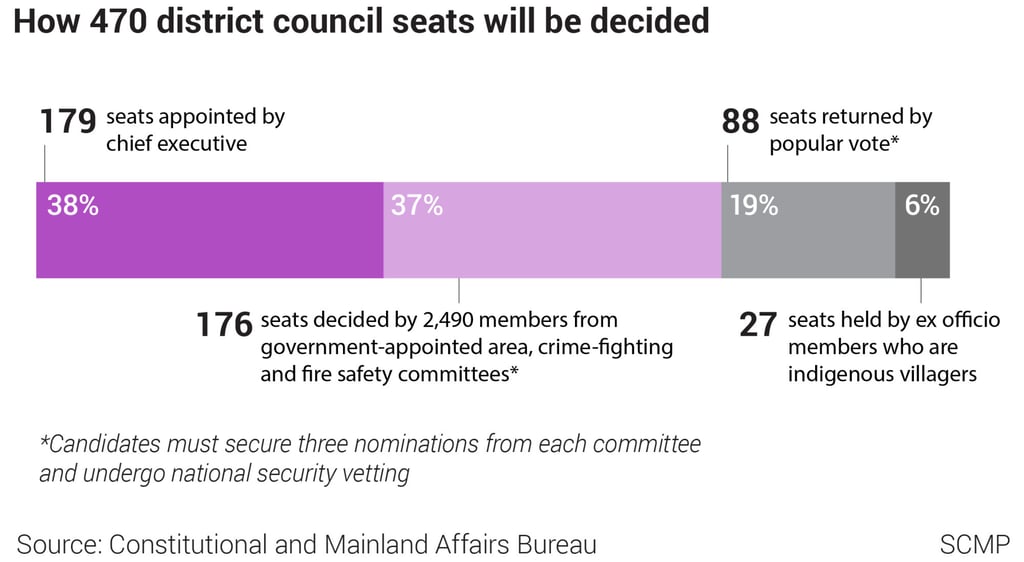 Under the proposal, only 88 out of the 470 seats will be directly elected by registered voters in the 44 constituencies. Another 355 seats will be appointed by the chief executive or chosen by members of three district committees.