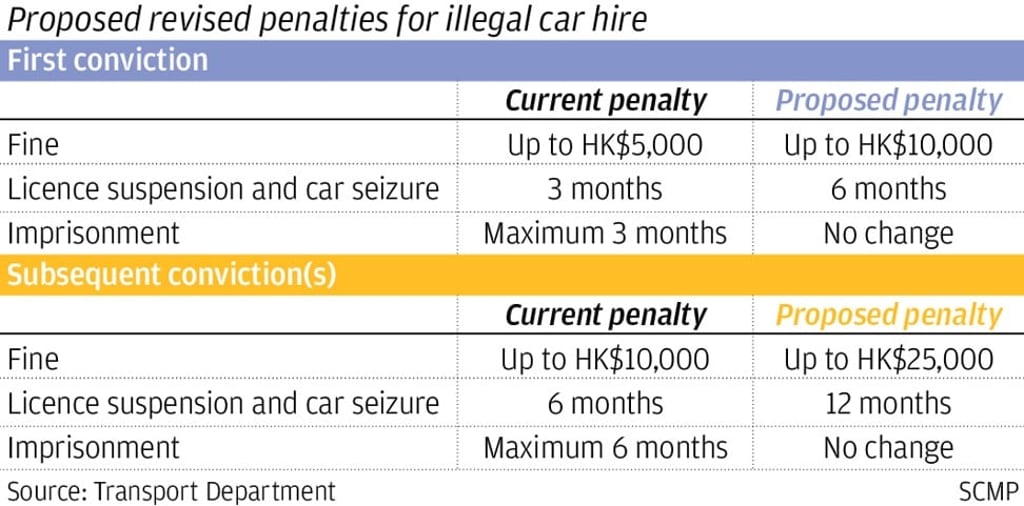 According to the proposal tabled at the Legislative Council, the maximum fine for illegal hires – in legal jargon, illegal carriage of passengers for hire or reward – would rise to HK$10,000 on first conviction, from HK$5,000. For subsequent convictions it would jump from HK$10,000 to HK$25,000.