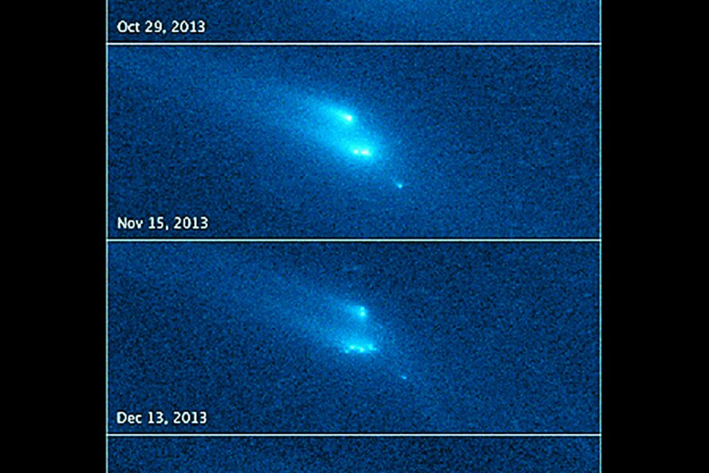 This series of Hubble Space Telescope images, released by Nasa, reveal the break-up of an asteroid over a period of several months in late 2013. The largest fragments are up to 200 metres in radius. The 10 pieces of the asteroid drifted apart slowly and showed a range of break-up times, suggesting that the disintegration cannot be explained by a collision with another asteroid.