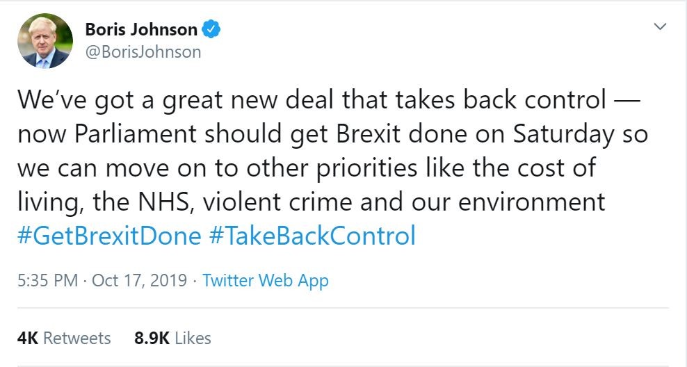 Johnson, who has pledged to take Britain out of the EU with or without an agreement, tweeted: “We’ve got a great new deal that takes back control – now Parliament should get Brexit done on Saturday.”