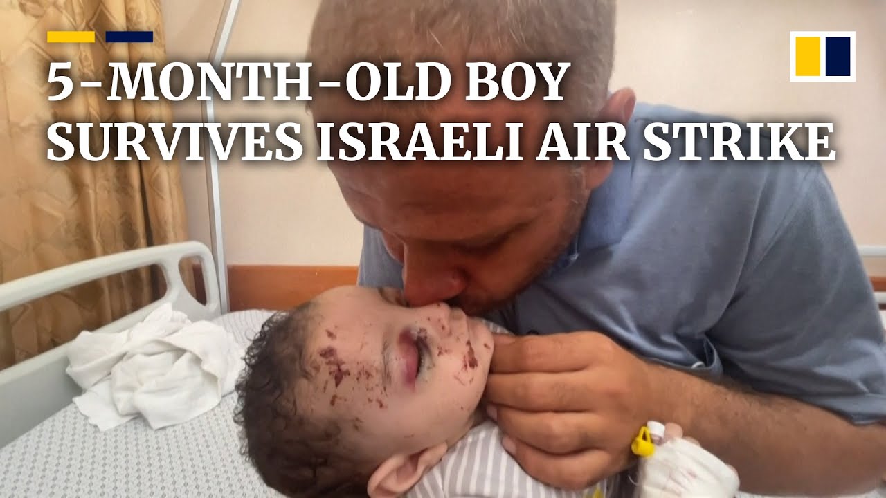 ‘He’s all that’s left’: Gaza father grasps infant son after Israeli air strike wipes out family