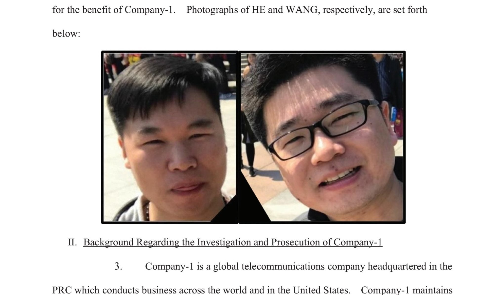 - Intelligence officers Guochun He and Zheng Wang are accused of bribing a law enforcement employee for information in a pending case against a telecoms giant