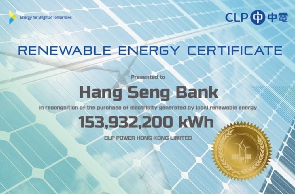 Hang Seng Bank aims to lead by example in facilitating the transition to a low-carbon future. In addition to the goal of becoming carbon neutral in its operations by 2030, Hang Seng is also the first local bank in Hong Kong to commit to 100% renewable energy use by 2030 via its own renewable energy sources and purchases of renewable energy certificates (‘RECs’). CLP Power has confirmed to Hang Seng Bank that it will provide the bank with close to 154 gigawatt hours of RECs over the next ten years, a record number of RECs ever allocated to a business customer since the launch of the programme in 2019. The RECs are equivalent to a reduction of over 60,000 tonnes in carbon emissions associated with electricity based on 2021 carbon intensity (0.39 kgCO2e/kWh).
