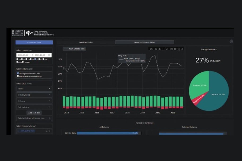 The Center has been developing a first-of-its-kind sentiment analysis dashboard based on FinBERT, a BERT model that outperforms other language models in the sentiment classification of financial texts. Aptly named FinSent, the fully automated dashboard visualizes sentiments of financial texts using cutting-edge natural language processing technologies, enabling users to gain insights into the financial sentiments of publicly traded companies through charts, graphs, and color-coded sentiment scores.