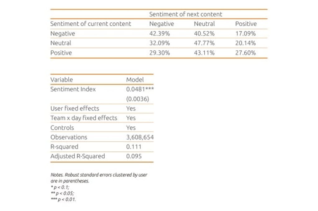 With 3.6 million pieces of content from 20 EPL subreddits in the 2017/2018 season, we run a regression model to check whether the sentiments of what users see would affect the sentiment of their next piece of content. The dependent variable of the model is the difference between the likelihood for the content to be positive and negative. A positive index means the content is more likely to be positive. Similarly, a negative index means the content is more likely to be negative. The main independent variable is a sentiment index, which measures the sentiments of contents that users see between their posts. Furthermore, we control various confounding factors, including the sentiment of their previous posts.