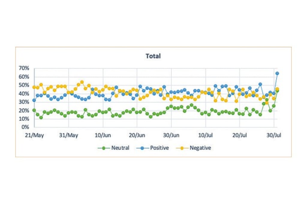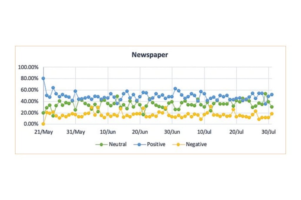 As a piece of model-free evidence, we depict the different trends of the daily proportion of sentiments (positive, neutral, and negative) across various media types. We observe that the total proportion of positive sentiment contents had increased during our empirical period (May 2020 to July 2020).