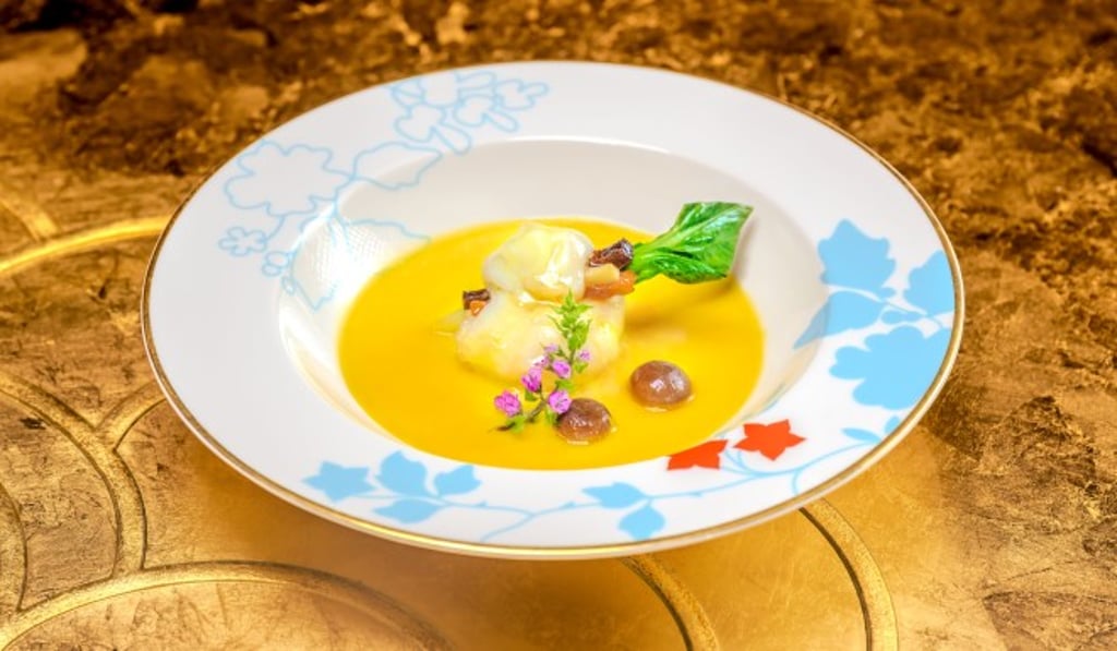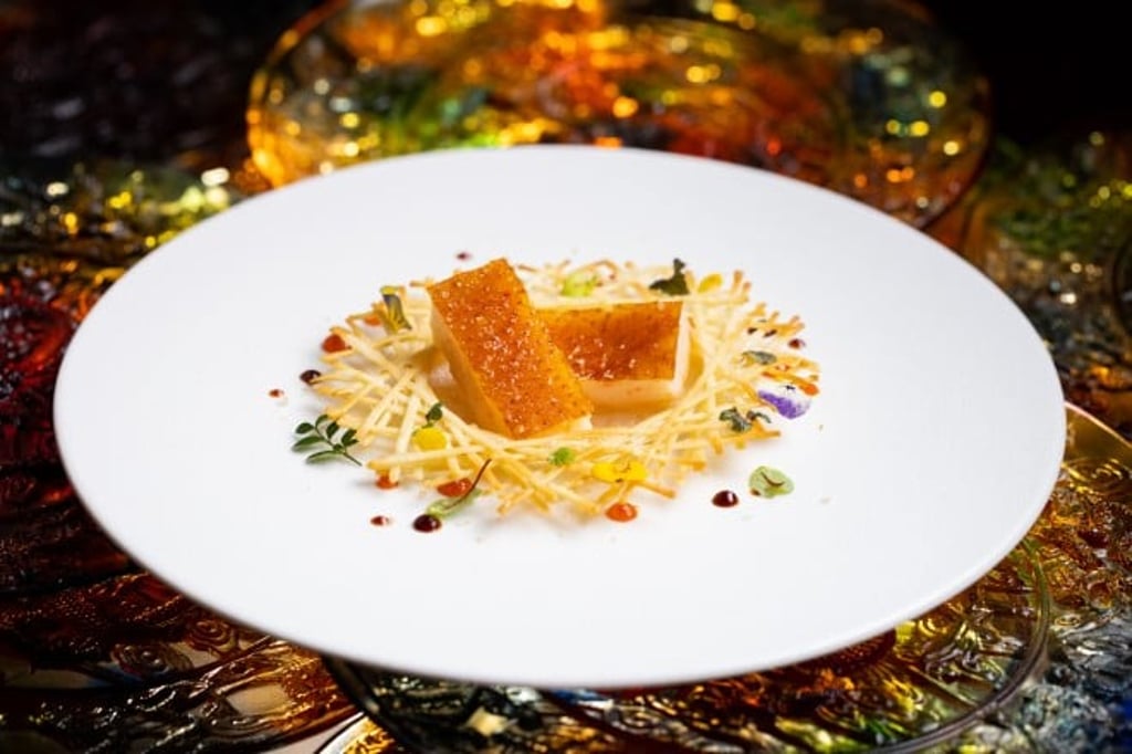 Among the highlights of the menu is the Crispy Fried Chicken Skin with Shrimp Mousse and Salted Fish Flakes, a nostalgic Lingnan classic reinvented by Chef Homan. The creation features a crispy-fried swapping steamed chicken skin top shell and a shrimp mousse made from three types of shrimps – Japanese Obsiblue prawn, Vietnamese white shrimp and Pearl River Delta’s Kuruma prawn. This combination results in an al dente texture and a vivid taste profile full of sweetness and umami. The refined creation is topped with freeze-dried salted fish flakes, a unique Macau specialty ingredient that imparts a rich depth of flavor. Its fishing net-inspired plating also pays homage to Macau's historic fishing village roots.