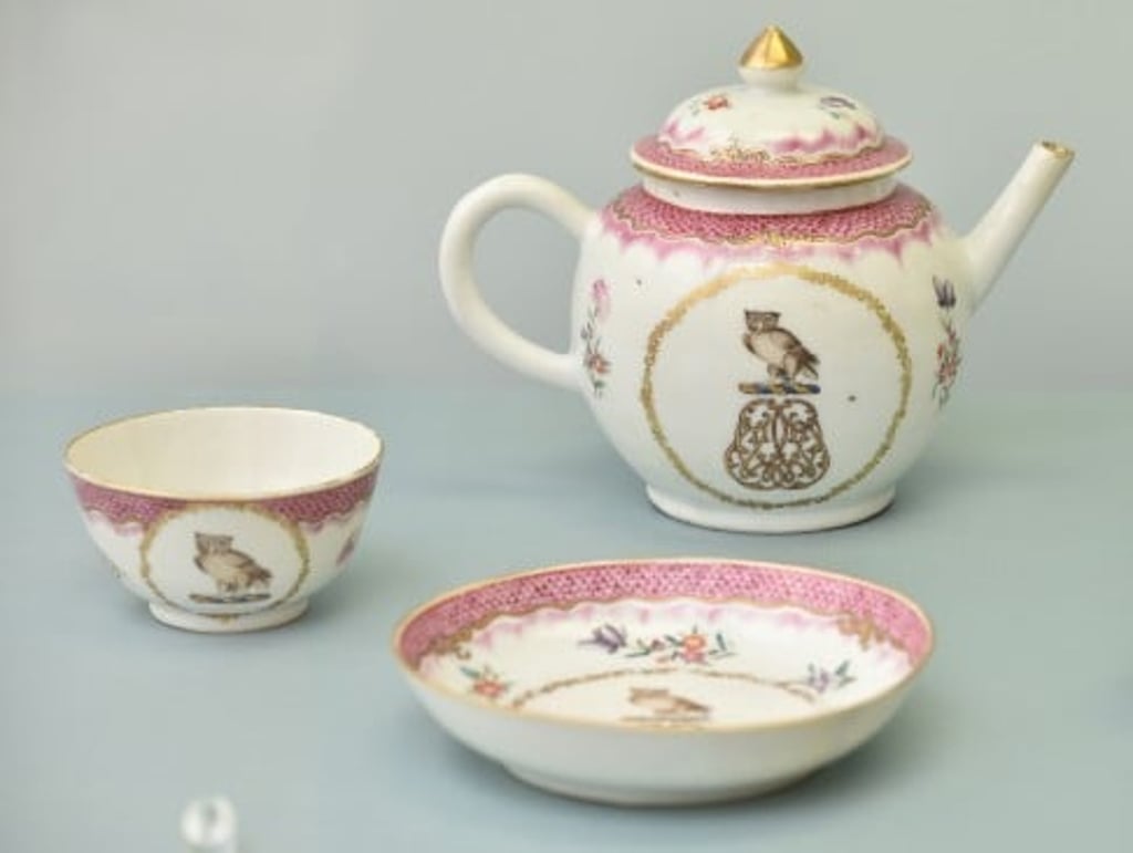 Highlights include a cup decorated with a harbour view in fencai enamels from the 18th century; a Woodley Crest tea set in fencai enamels decorated with a picture of an owl; and an export teapot of globular shape with painted Western figure scenes in opaque enamels and gilt added in England.