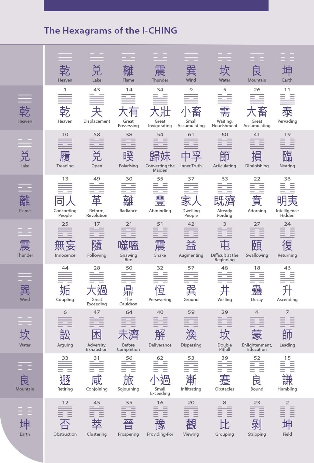 In the I-Ching, each hexagram is composed of six horizontal lines representing the interplay of yin (“⚋”) and yang (“⚊”), which are opposite yet complementary forces. The yin and yang symbol first combine to form eight basic triagrams, which are then further combined in pairs to create 64 complex hexagrams.