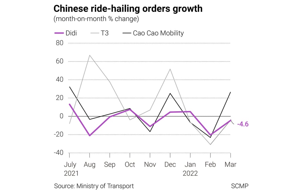 - Didi orders fell 4.6 per cent in March from the previous month, according to China’s transport ministry, and have fallen 29 per cent since last June