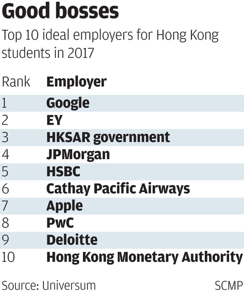 United States internet giant Google, British professional services firm EY and the Hong Kong government lead the latest ranking of the most sought-after employers for the city’s university students, according to a new survey.