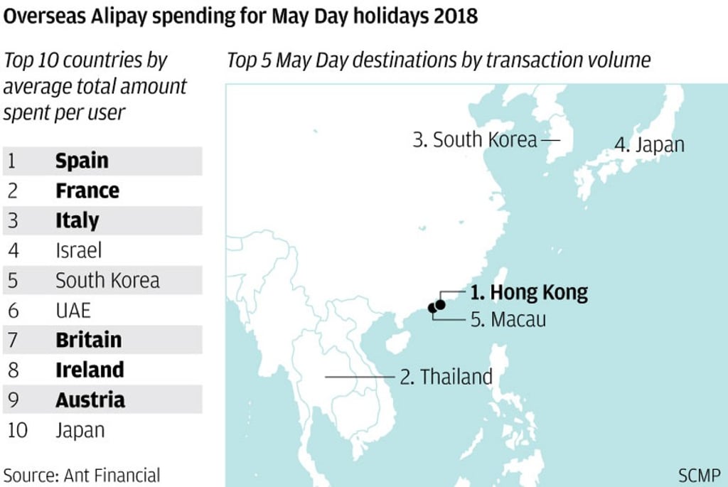 Data from Ant Financial, an affiliate of e-commerce giant Alibaba Group Holding, showed that Hong Kong, Thailand, South Korea, Japan and Macau were the top five destinations for Chinese tourists, measured in terms of Alipay transaction volume, during the three-day holiday period.