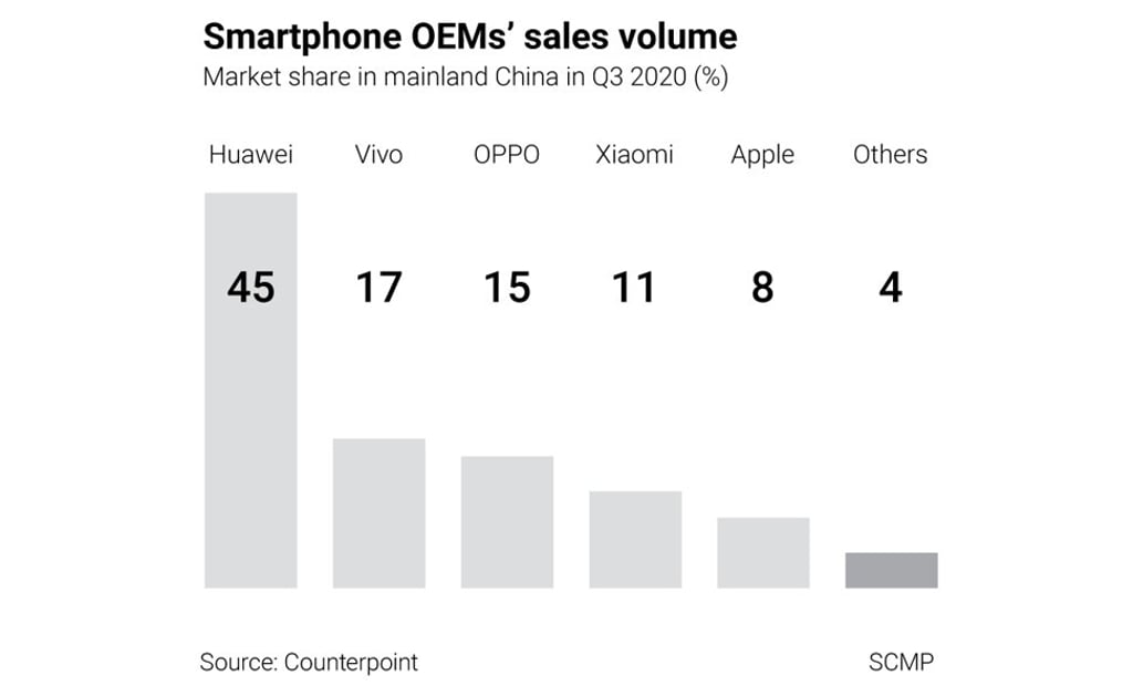 While it is still the biggest player in the market, Huawei’s shipments fell 18 per cent year-on-year to 34.2 million units and its market share shrunk from 44.3 per cent in the previous quarter to 41.2 per cent in the third, Canalys said in a report released on Friday.