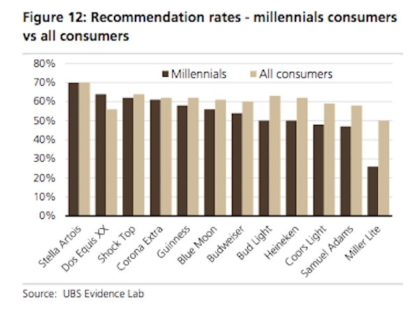 UBS’s survey of how likely millennials are to recommend different beer brands provided further evidence that this generation is simply less into almost every type of beer than Baby Boomers and Gen X.