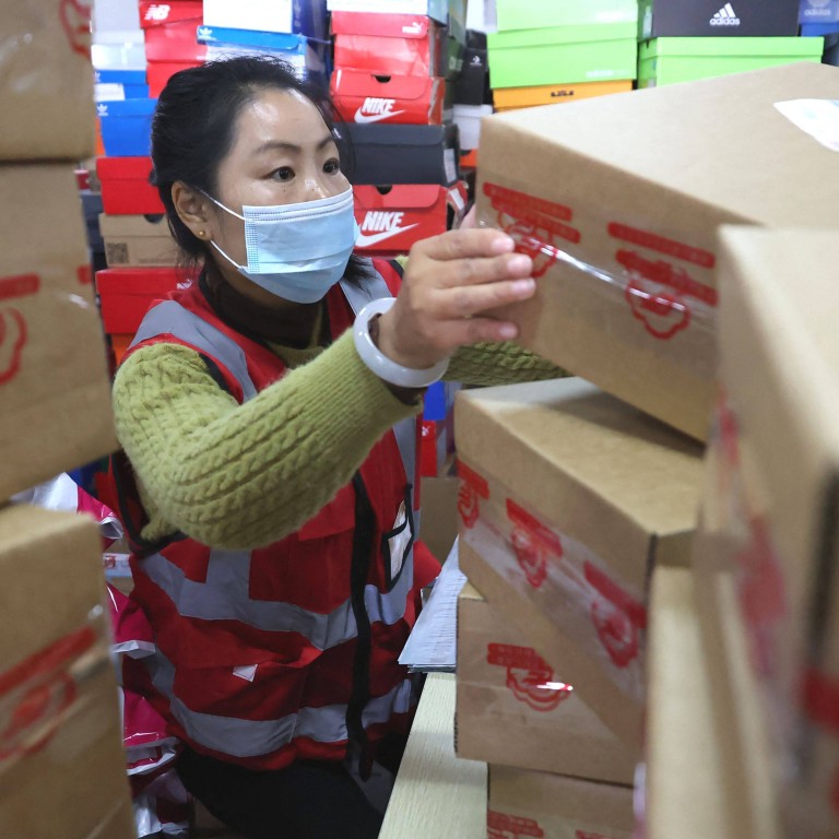 An employee sorts packages for delivery ahead of the Singles’ Day shopping festival at Tianma E-commerce Industrial Park in Lianyungang, Jiangsu province on Tuesday. Photo: AFP